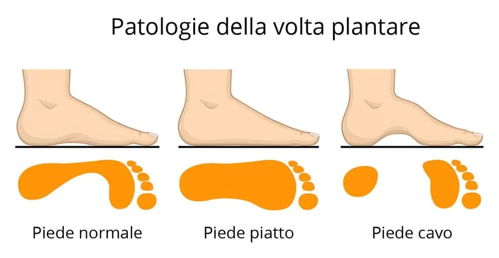 Il piede piatto e il piede cavo sono due anomalie della volta plantare (costituita dai 3 archi di cui accennato poco prima) che causano un alterato appoggio del piede al suolo. Si tratta di due condizioni particolari in cui la volta plantare del piede è troppo bassa (piede piatto) o troppo alta (piede cavo) rispetto alla norma.